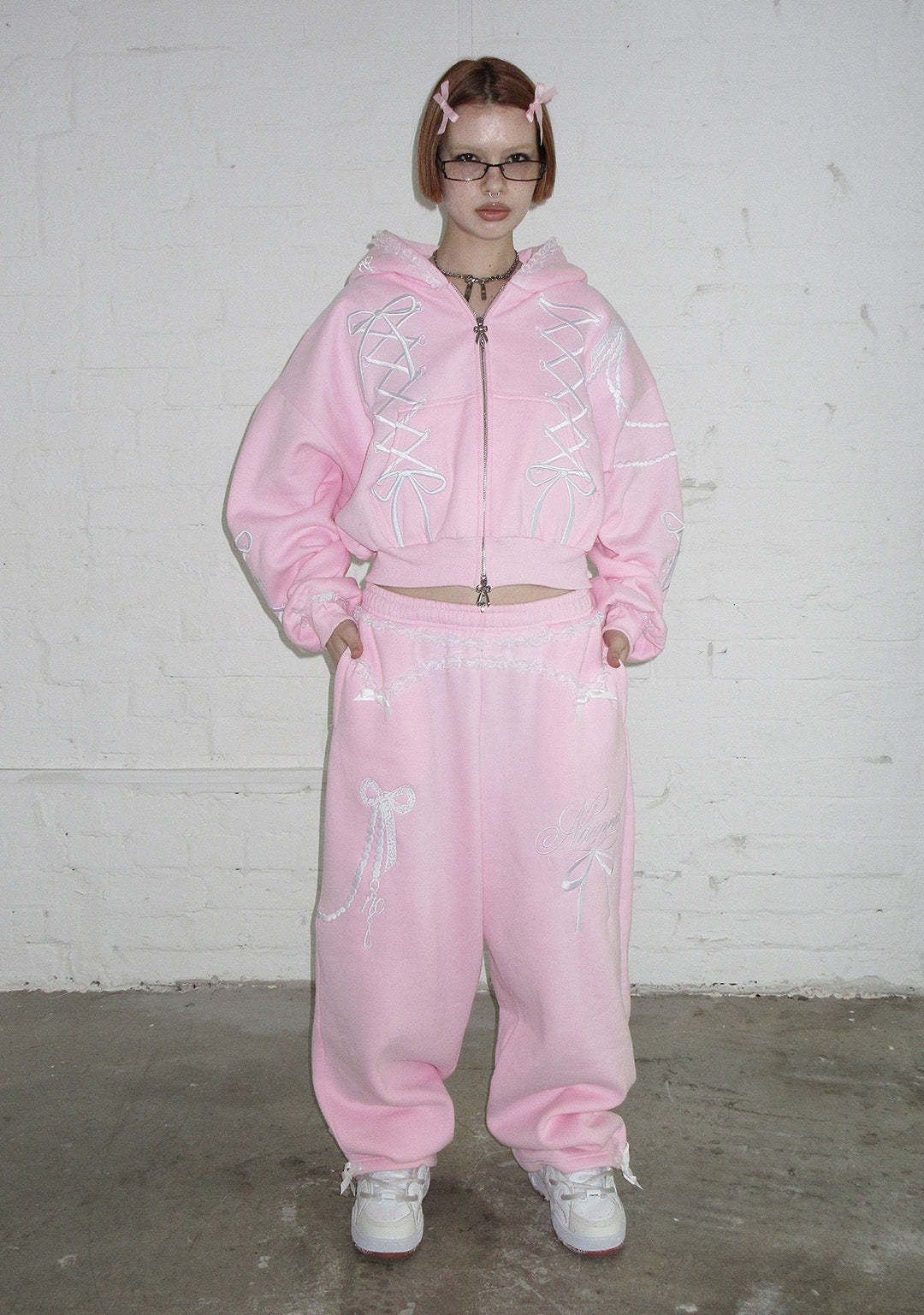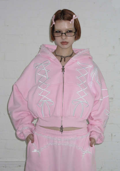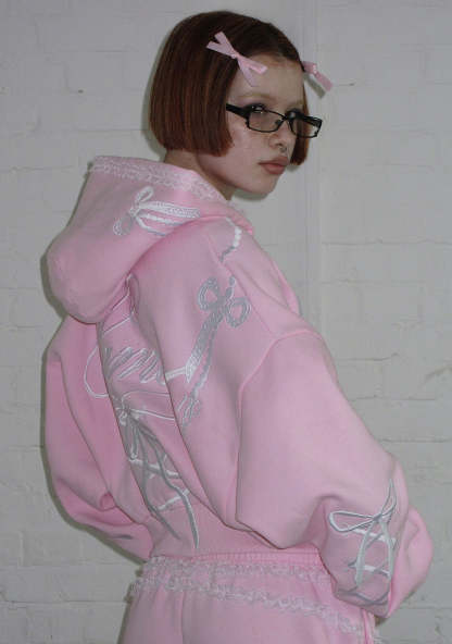 CONFESSIONS EMBROIDERED CROP ZIP HOODIE BABY PINK
