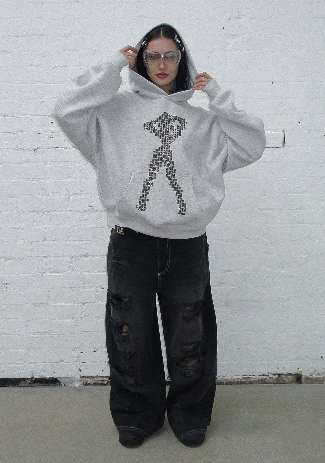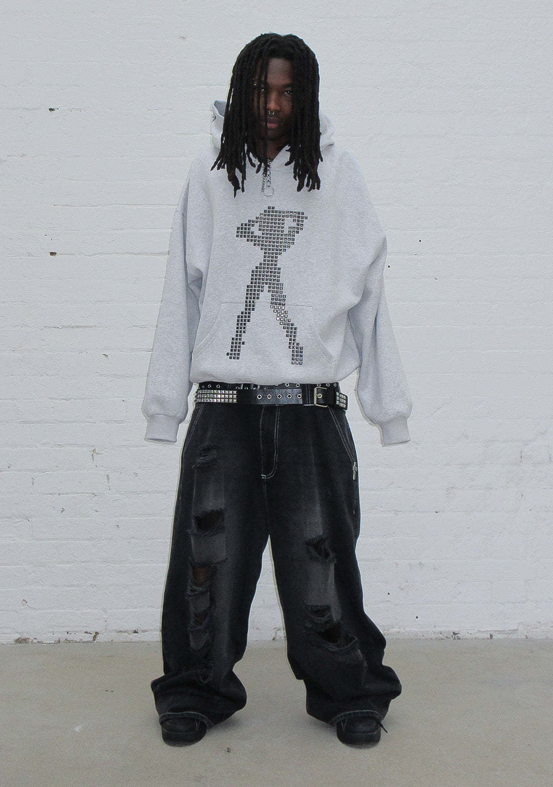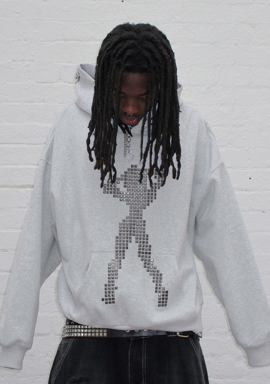 STRANGERS STUDDED SILHOUETTE PULLOVER HOODIE GREY MARL